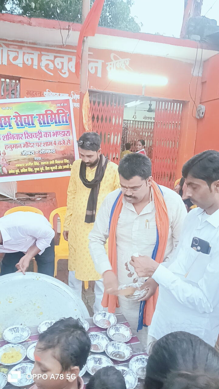ओबरा /सोनभद्र।नगर के सुभाष तिराहा के पास हनुमान मंदिर प्रांगण में श्री राम सेवा समिति के द्वारा पांचवा शनिवार को भव्य खिचड़ी भंडारा का आयोजन किया गया। जिसमें मुख्य अतिथि ओबरा कोतवाली निरीक्षक विजय चौरसिया जी एवं आनंद पटेल दयालु रहे। विश्व हिंदू महासंघ नगर अध्यक्ष सर्वेश दुबे, आशीष मिश्रा, रणजीत तिवारी, विभास घटक, ओम प्रकाश सिंह, बाबूलाल, पुष्पा दुबे, सरिता सिंह, एवं दर्जनों समाजसेवी एवं कार्यकर्ताओं ने अपना बहुमूल्य समय देकर इस कार्यक्रम को सफल बनाने में सहयोग दिया।