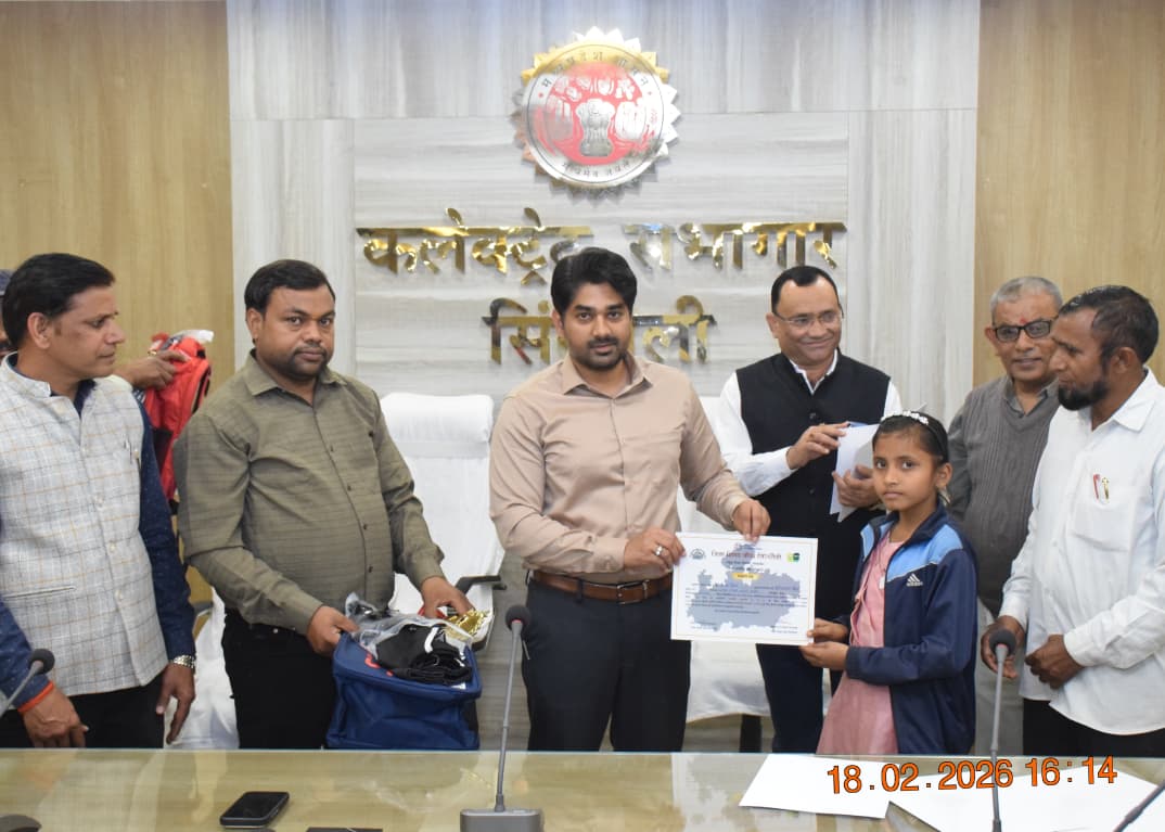 सिंगरौली 18 फरवरी / कलेक्टेªट सभागार में कलेक्टर गौरव बैनल द्वारा जिला स्तरीय ओलंपियाड अंतर्गत प्रतियोगिता में चयनित विद्यार्थियों को सम्मानित किया गया।सम्मान समारोह में कक्षा 2 से कक्षा 8 के उत्कृष्ट कक्षा व विषय में जिले में जिला स्तरीय ओलंपियाड परीक्षा में प्रथम आए विद्यार्थियों, कुल 30 छात्रों, एवं उनके मार्गदर्शन शिक्षकों को सम्मानित किया गया। जिला स्तरीय प्रतियोगिता में शासकीय मॉडल संदीपनी विद्यालय चितरंगी के 9 छात्र शामिल रहे। वही 4 छात्रो द्वारा अपने विषय अंतर्गत शत प्रतिशत अंक प्राप्त किया गया। चयनित विद्यार्थियों को मार्गदर्शक शिक्षकों के साथ प्रमाण पत्र एवं शील्ड प्रदान की गई।प्रोत्साहन हेतु छात्रो को स्कूल बैग एवं ट्रेक सूट भी दिया गया।
